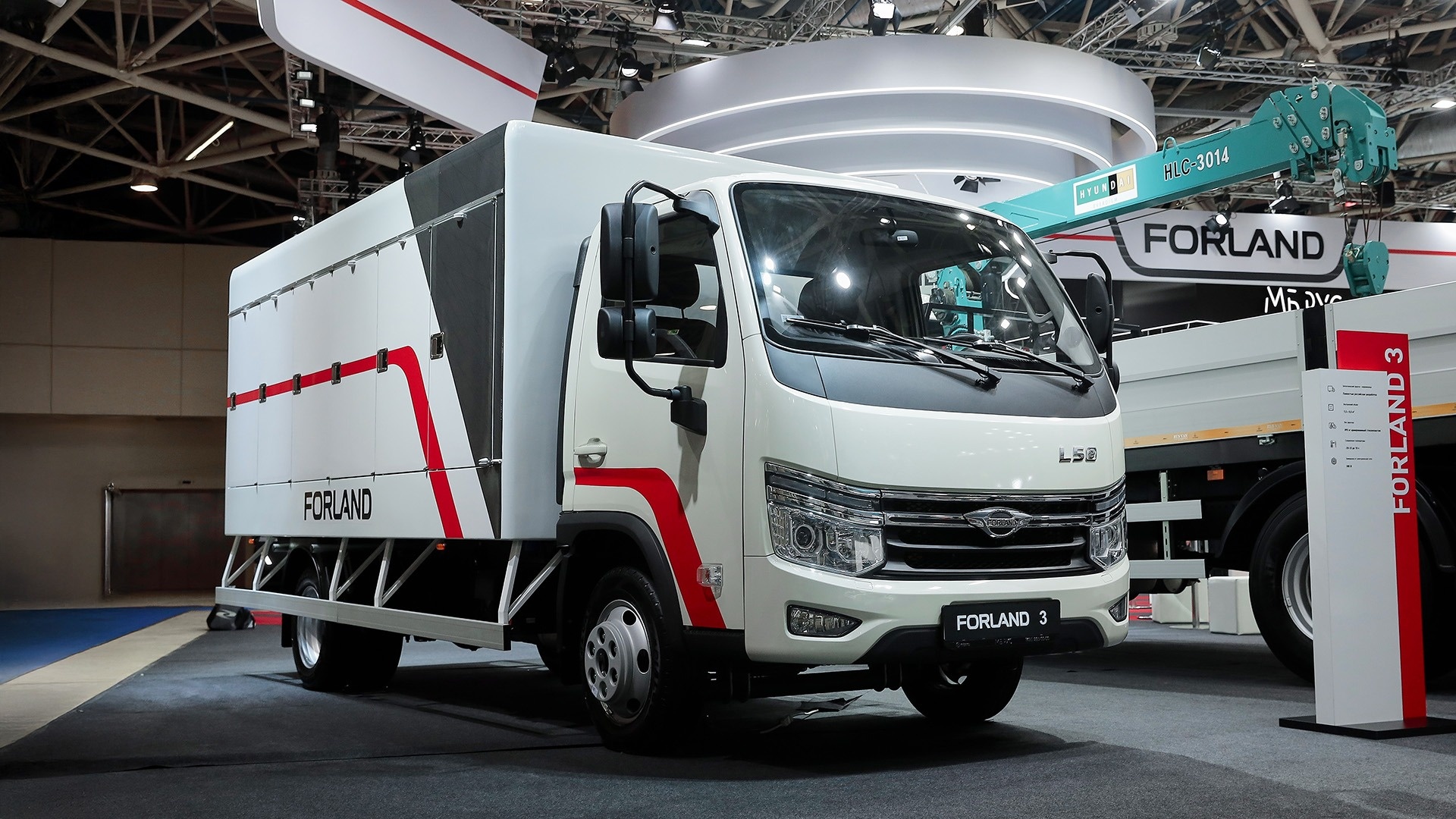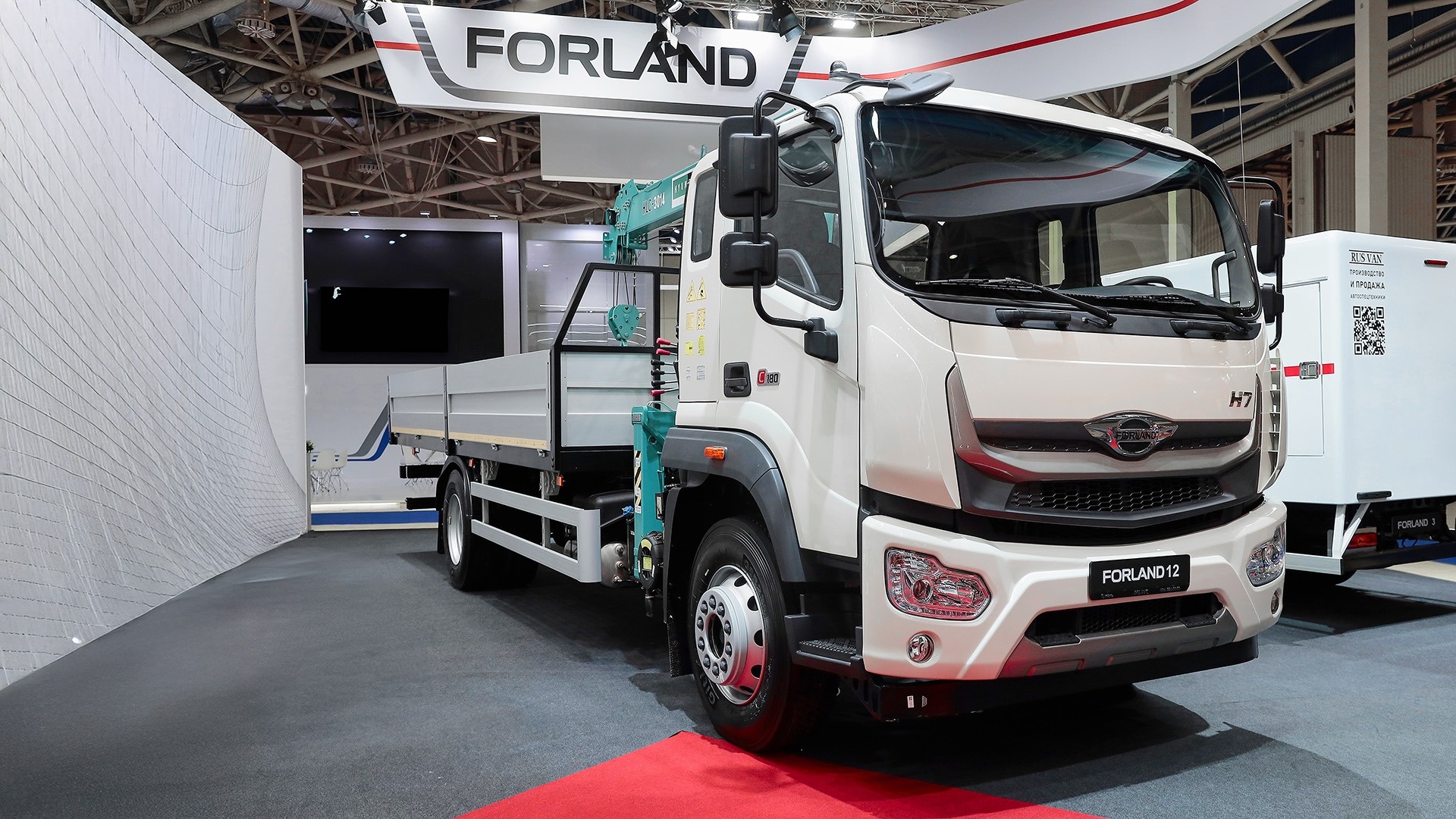 В ходе выставки также можно ознакомиться с еще одной новинкой техники – КМУ на шасси Forland 12 полной массой 11990 кг. Автомобиль с удлиненным задним свесом укомплектован силовым агрегатом мощностью 209 л. с., а также 8-ступенчатой механической коробкой передач. Крутящий момент – 760 Н·м. Рама шасси изготовлена из высокопрочной легированной стали. Объем топливного бака – 600 л.